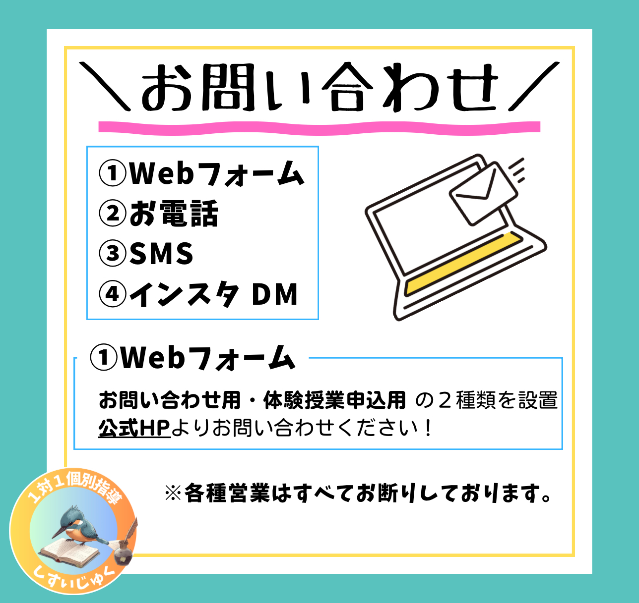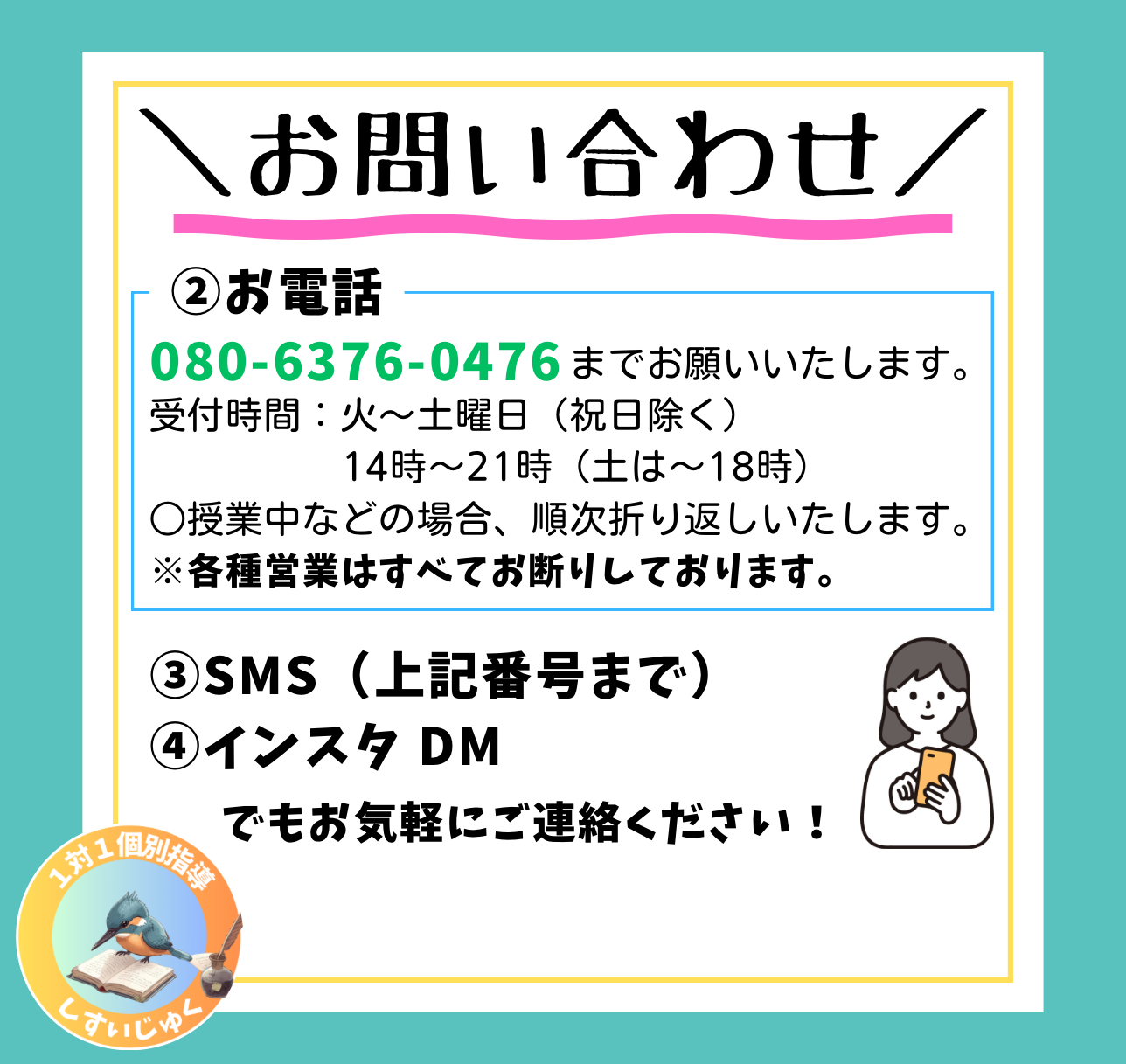 祉翠塾へのお問い合わせ方法について【各種営業はすべてお断りしております】 2025年5月27日 最終更新日時 : 2026年1月16日 塾長 ①Webフォーム 【質問、確認したいことがある、まだ体験授業の受講は検討中という方はこちら!】 お問い合わせ用フォーム 【体験授業を申し込みたいという方はこちら!(ご質問なども可能です)】 体験授業用フォーム ②お電話 ○受付時間:火~土曜日(祝日除く) 14時~21時(土は~18時) 授業中などの場合、順次折り返しいたします。 080-6376-0476※各種営業はすべてお断りしております。 ③SMS ○080-6376-0476 までお願いいたします。 ④インスタ DM 祉翠塾 公式Instagram FacebookXCopy