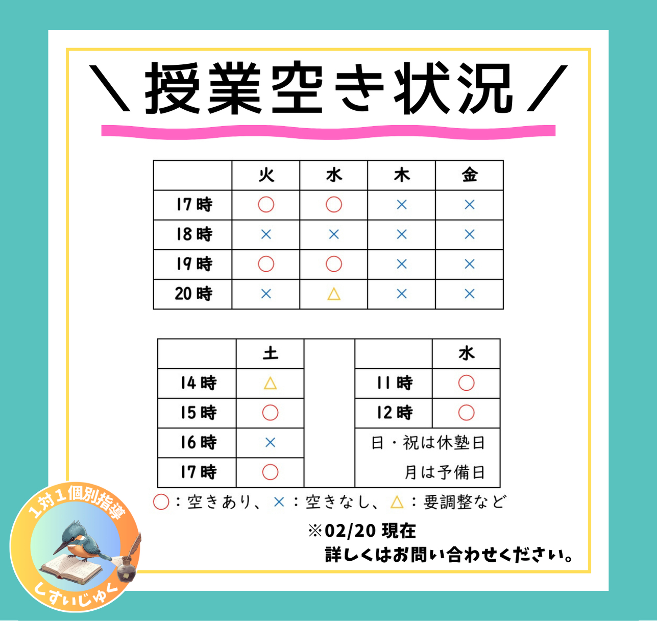 授業空き状況(02/20更新) 2026年1月14日 最終更新日時 : 2026年2月21日 塾長 ※詳しくは弊塾までお気軽にお問い合わせください。 「1対1」指導方式というシステム上、同時期にご通塾いただける人数に限りがございます(~15人前後を想定)。大変ご不便をお掛けしますが、ご入塾を検討していただいている方はお早めにご連絡いただければ幸いです。 \体験授業受付中!/ 只今祉翠塾では、新年度に向け新規塾生を募集中です! 「1対1」授業にご興味のある方、是非お気軽に体験授業をご受講ください。相談なども随時受け付けております。 FacebookXCopy